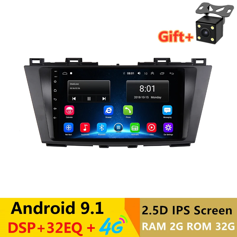 Car dvd player with navigation ForMazda 5 2009 2010 2011 2012 2013 Note: We have done our best to ensure this item is compatible with the listed cars, butplease ensure you have the correct shape / size OEM unit before purchasing. Main FEATURES: 1.Systemversion:thesystemversionisandroid9.1,thecpucoreisandroid6.0,itdoesn'taffecttheprogramspeed,ifyoucareitstrongly,pleasedonotbuy ! which enable you to get access to thousands of apps,like Twitter, Facebook, Youtube, Gmail and other Google Services. 2. Quad-Core CPU:ARM Cortex A53, DDR32GB RAM , ROM 32GBNand (system will occupy somememories, about 25.7GBavailable) 3. 1024*600 Capacitive screen ,2.5D IPS screen 4. Built-in Wifi ;Radio chip: 6851 ;Amplifier chip:7850 ; with DSP+32EQ; 5. Suppport 1080P Video 6. Support OBD and DV 7. Built-in GPS 8. Dual zone function (can listen to the music or Radio while using GPS navigation software) 9. Built-in Bluetooth Hands free and Phone book, support A2DP, play music via phone. 10. FM/AM Radio 11. Support HD 2D & 3D maps 12. Support Mirror Link 13. Support Rearview camera and USB DVR 14. Support Steering Wheel Control 15.Support 3G/4G 16. 4X45W maximum power output 17. Optional External , Rear camera,USB DVR ,ODB .